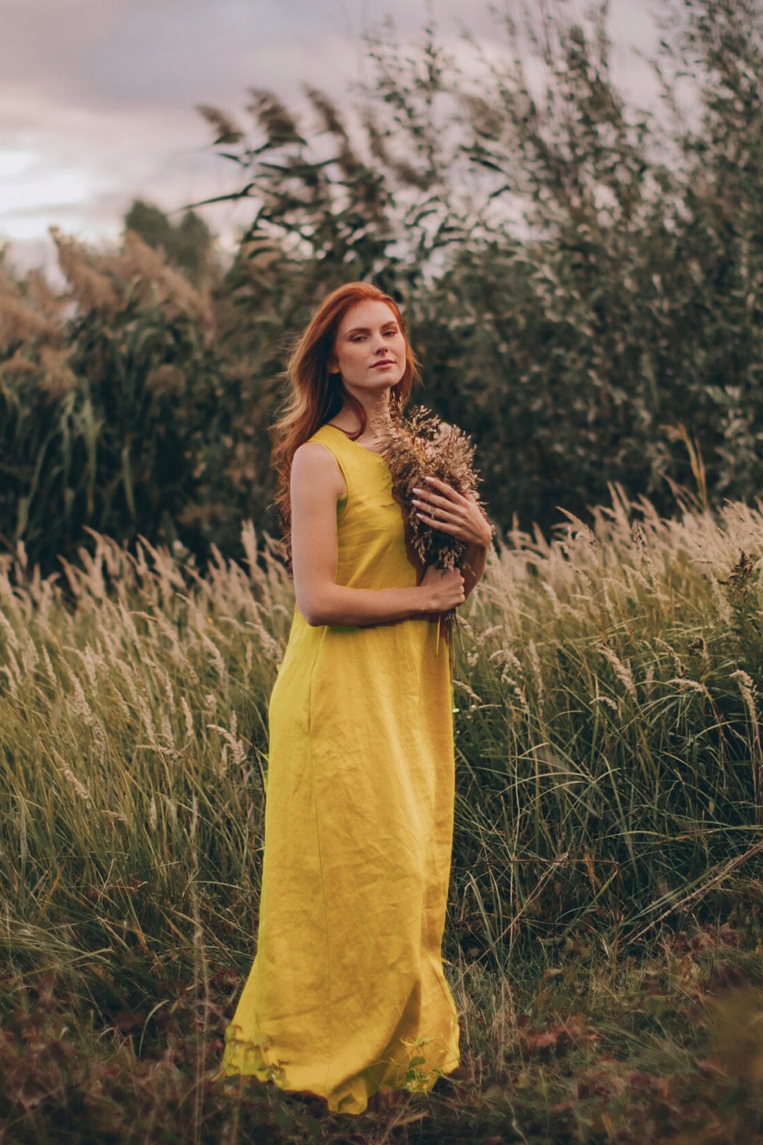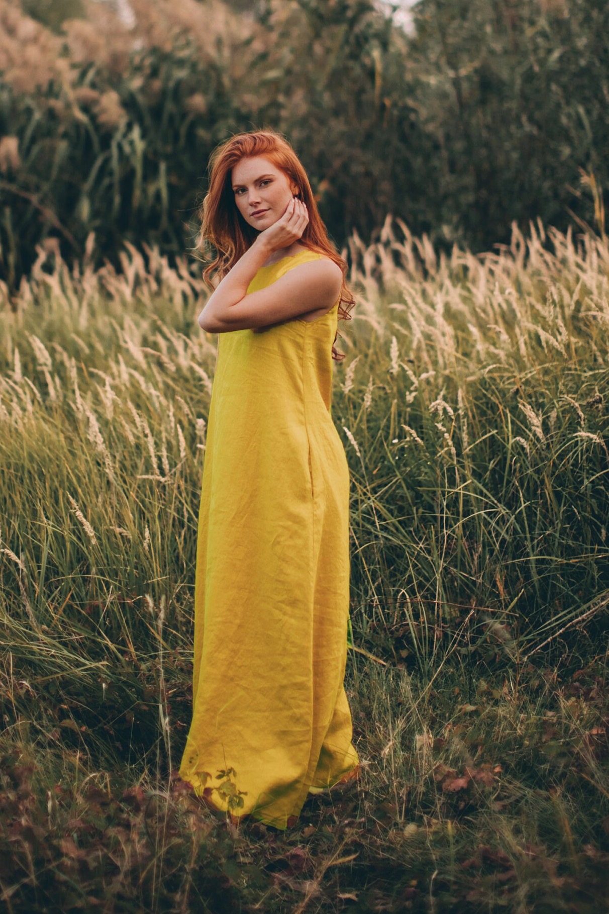 ♠ Sleeveless minimalist dress – perfect match for bold jewelry. Long and soft, this maxi dress is made of pure linen that is breathable and pleasant to your body. A classic and elegant style for your summer everyday wardrobe. Pictured in a mustard shade here, this dress is also available in other beautiful colors