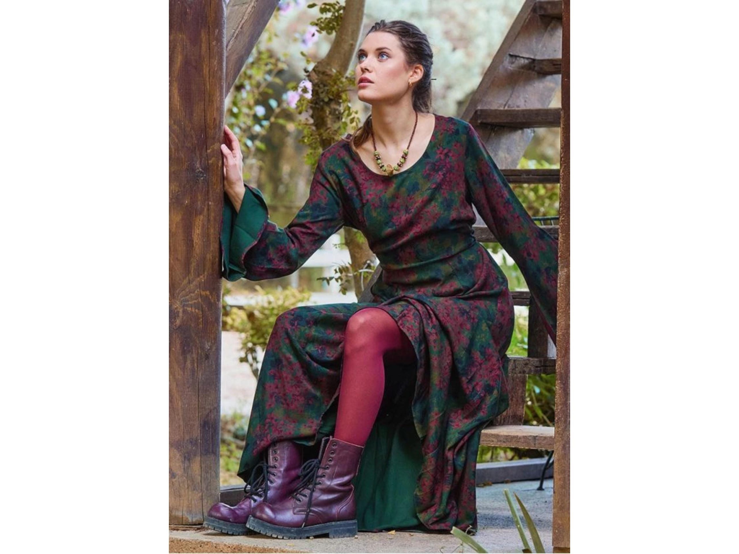 Add a touch of timeless elegance to your winter wardrobe with this Off-Shoulder Green Maxi Dress with Waist Tie and Flared Sleeves.