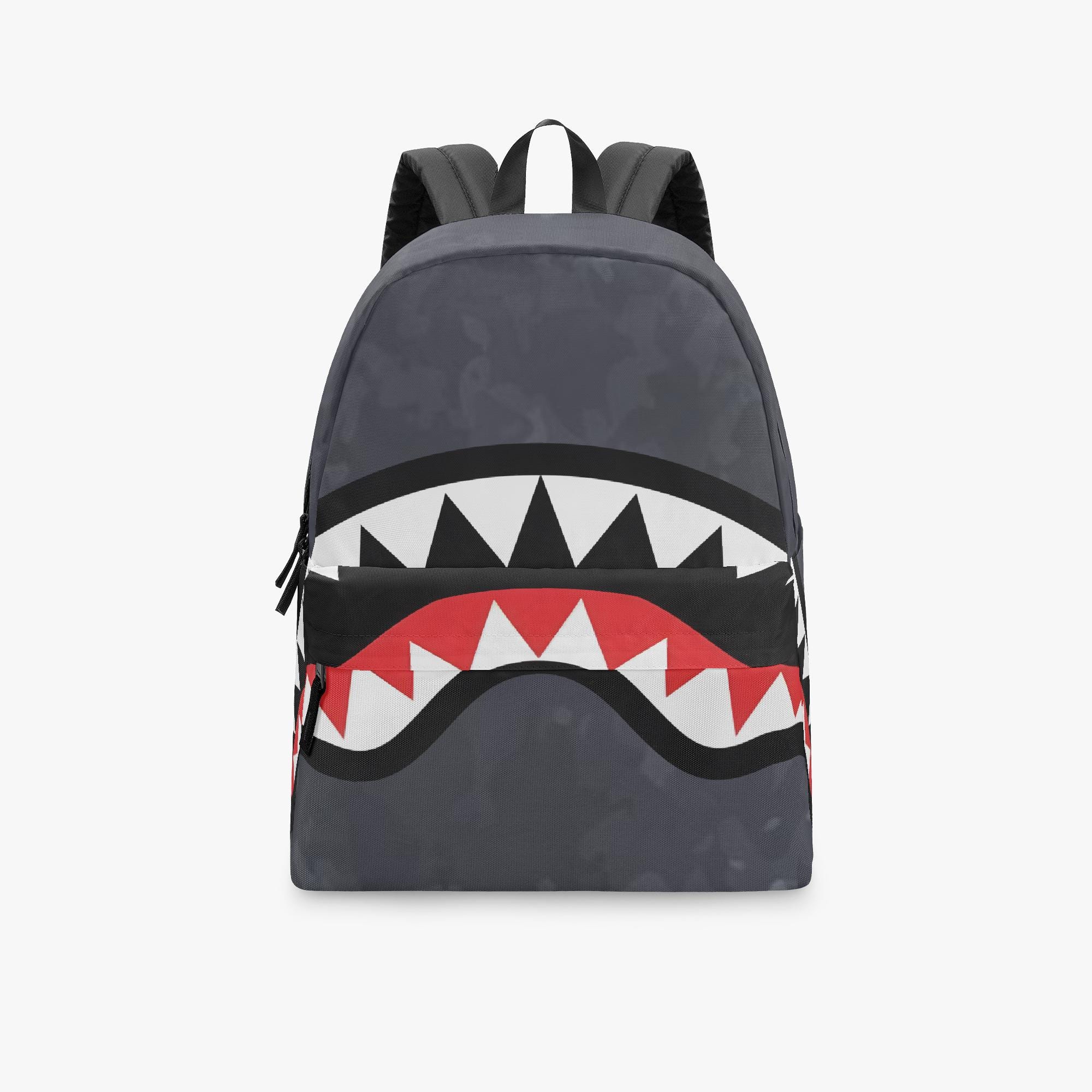 Bite into your day with this Shark Teeth Camo Backpack. A bold all-over print, padded back, and roomy interior make it perfect for school, travel, or street style. Unisex design; durable polyester; two side pockets for bottles; smooth zipper.