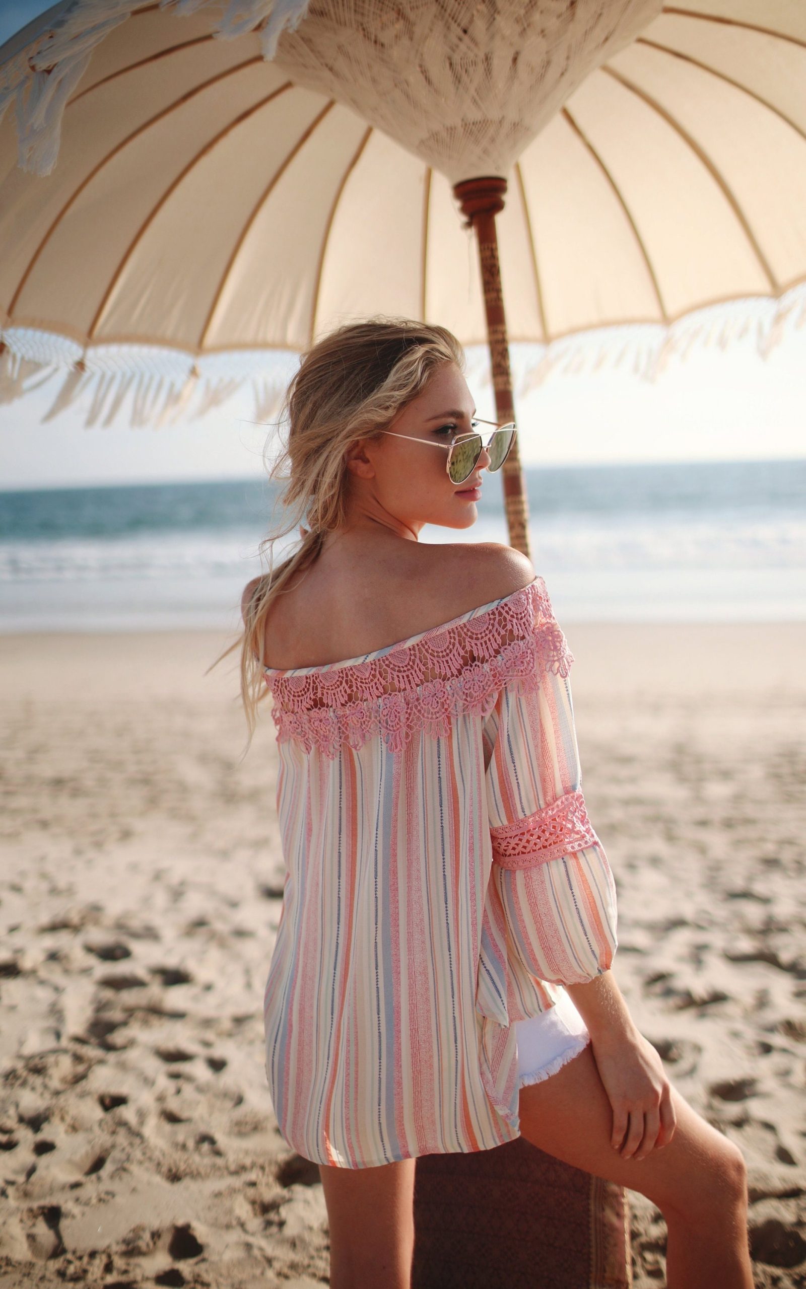 Comfortable, multi-color striped off-shoulder top with lace details.