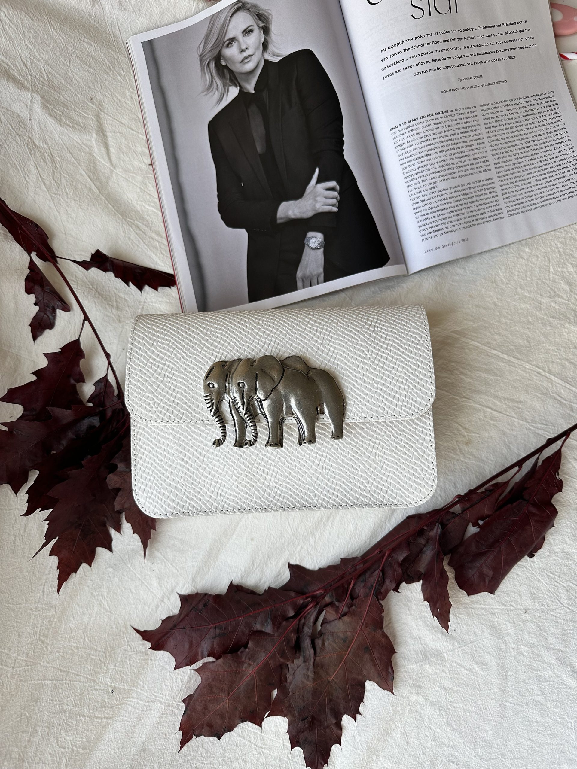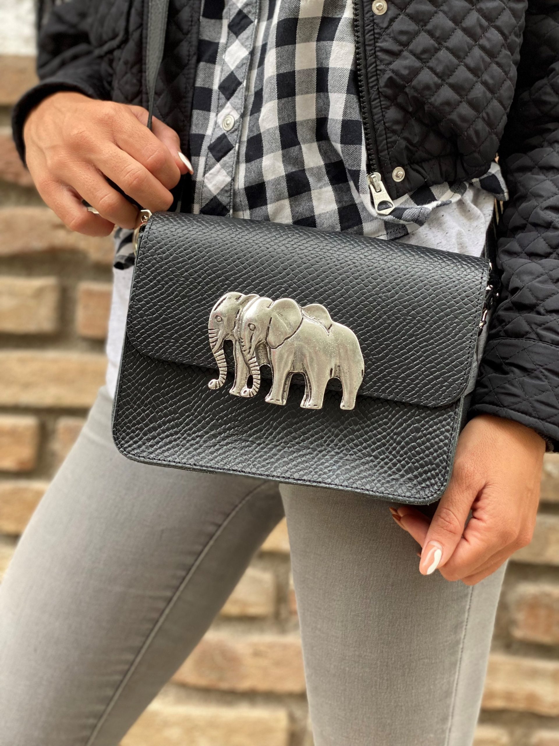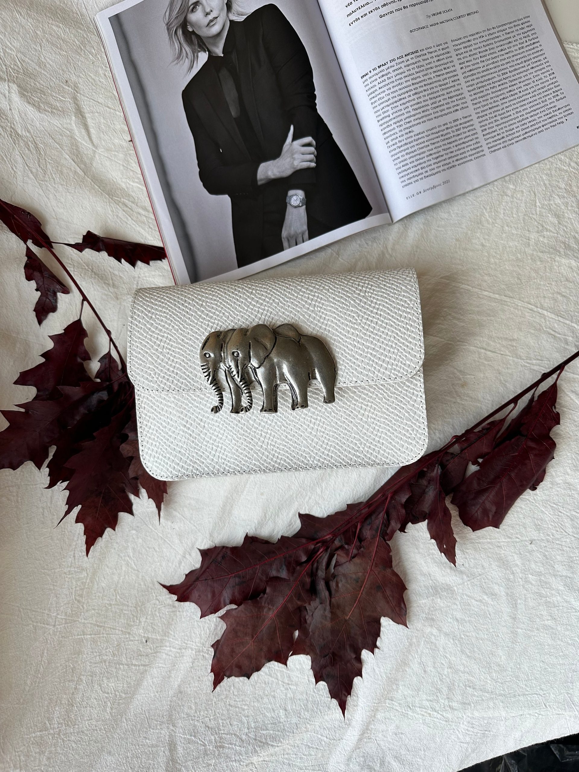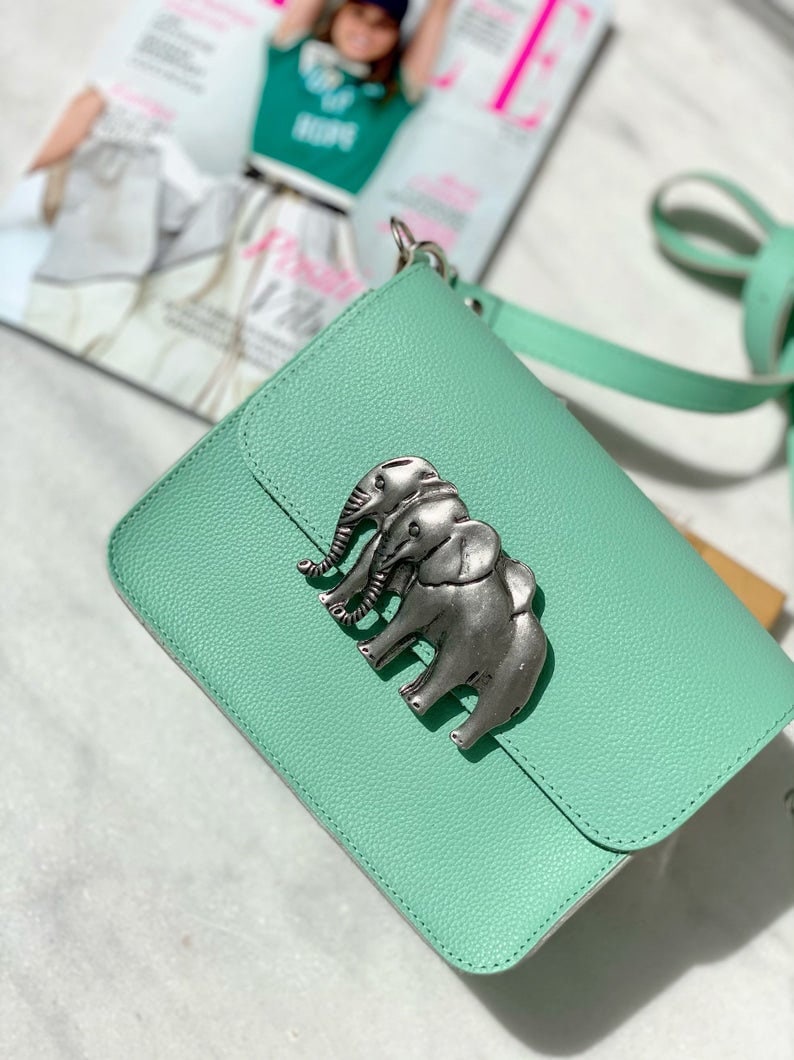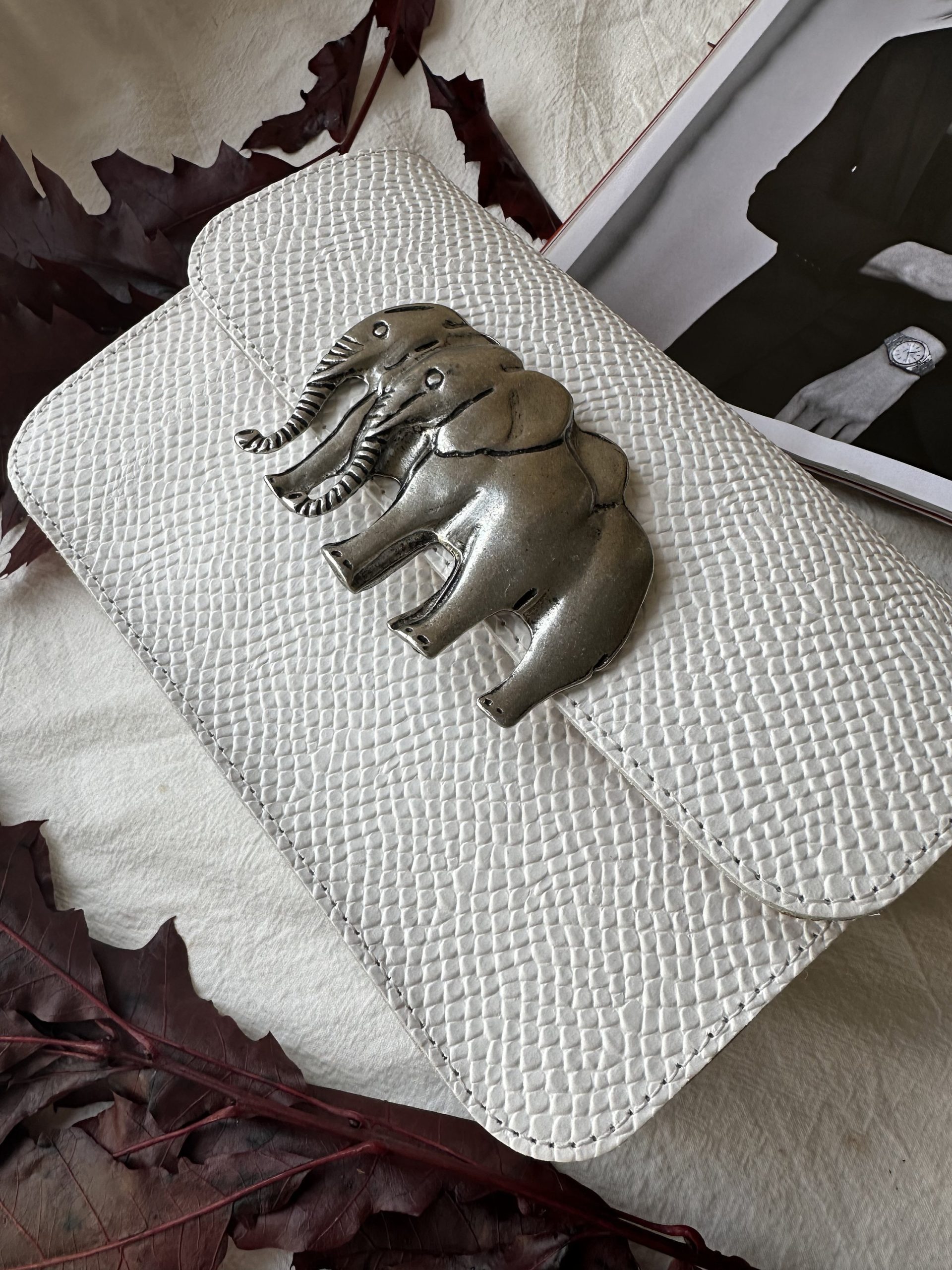 A White Leather Crossbody Bag that is made from full grain leather and I also decorate the front side with a unique elephant buckle. It’s shape is rectangular you can select between small or medium size, and white or black color. The interior is single and spacious with a zipper pocket at the back side that gives extra comfort for your belongings. (The size at the photo is SMALL) Find it only at us Store.