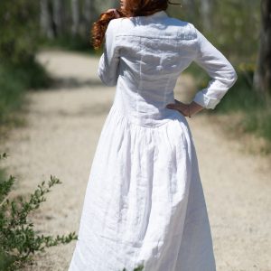 Linen Maxi Dress: White Buttons Casual Shirt Style